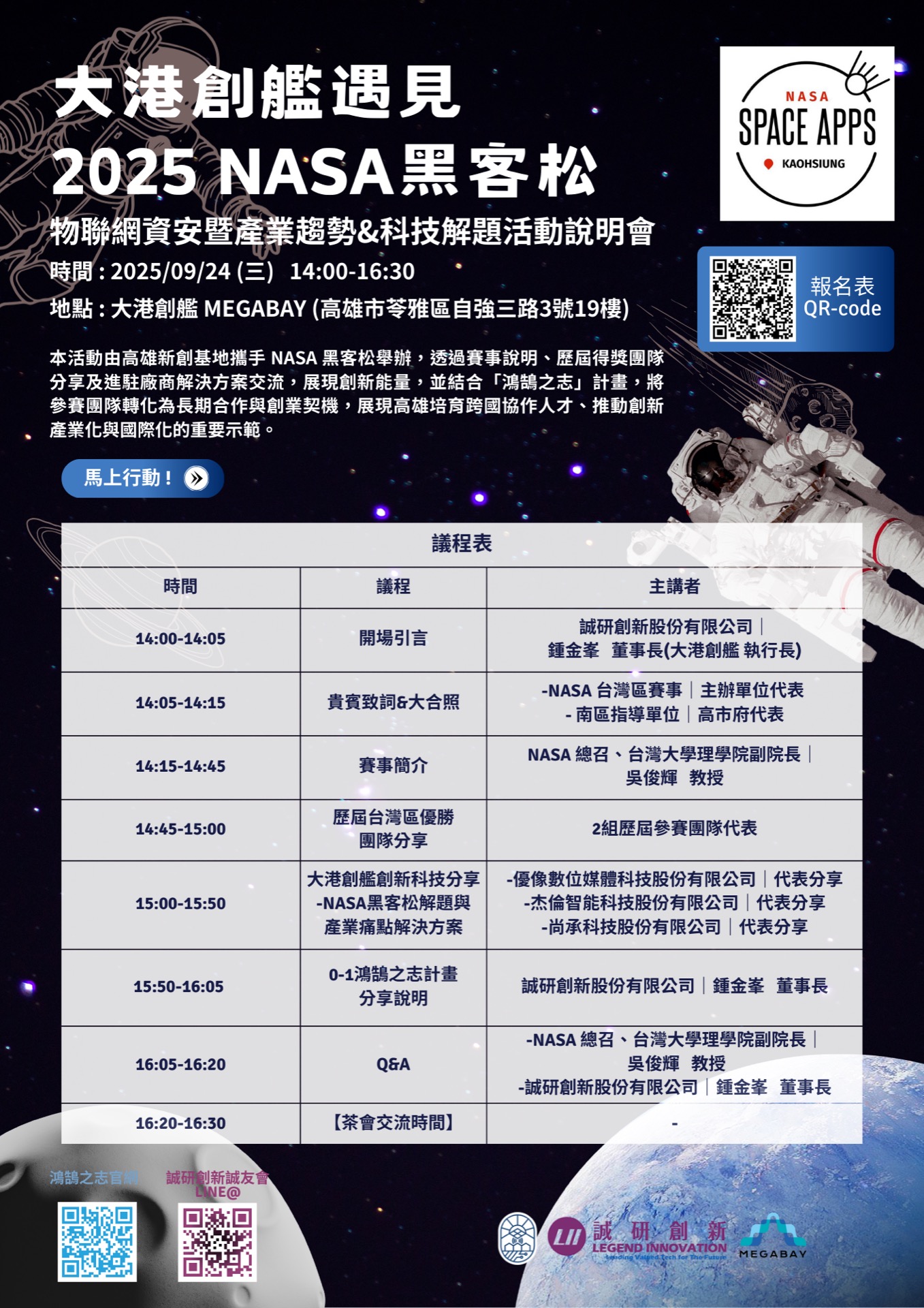 本次由高雄新創基地與 NASA 黑客松合作舉辦的「大港創艦,遇見 2025 NASA 黑客松」記者說明會暨產業交流活動,不僅強化跨國協作與跨文化交流,也讓新創團隊、學生團隊與在地產業有機會透過國際級賽事場域,展現技術實力與創新應用。本次記者會同時佈達NASA 黑客松賽事說明,活動安排還包含歷屆得獎團隊分享,以及大港創艦進駐廠商的解決方案交流,從 IoT 資安到 AI 智慧製造,對接全球挑戰與在地需求。