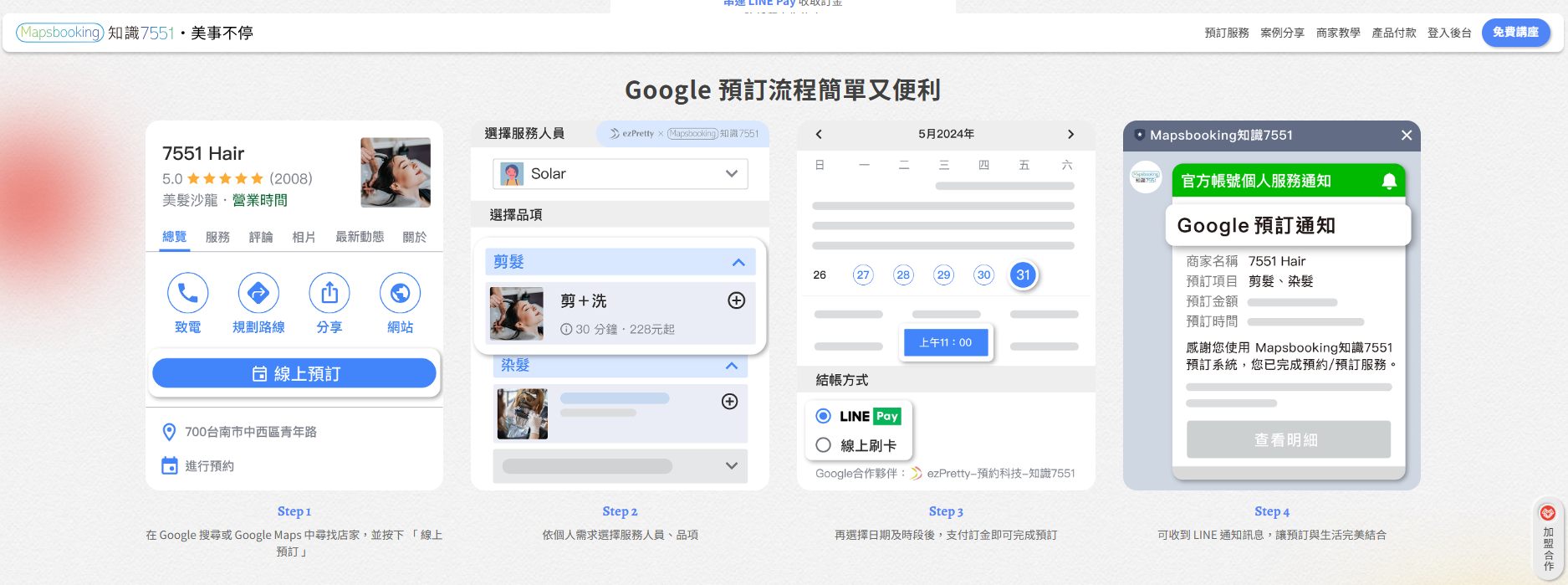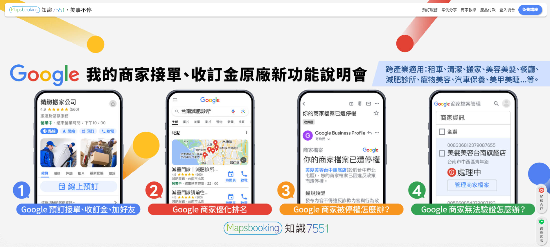 在本次活動中,誠研創新邀請知識科技股份有限公司,實際展示其 「地圖預訂(Mapsbooking)」 解決方案。該系統可直接串接 Google 搜尋與 Google 地圖,讓消費者在搜尋商家時,即可透過手機一鍵完成預約、訂位或服務時段選擇,並可整合行動支付與自動通知機制,建立完整的線上預訂流程。