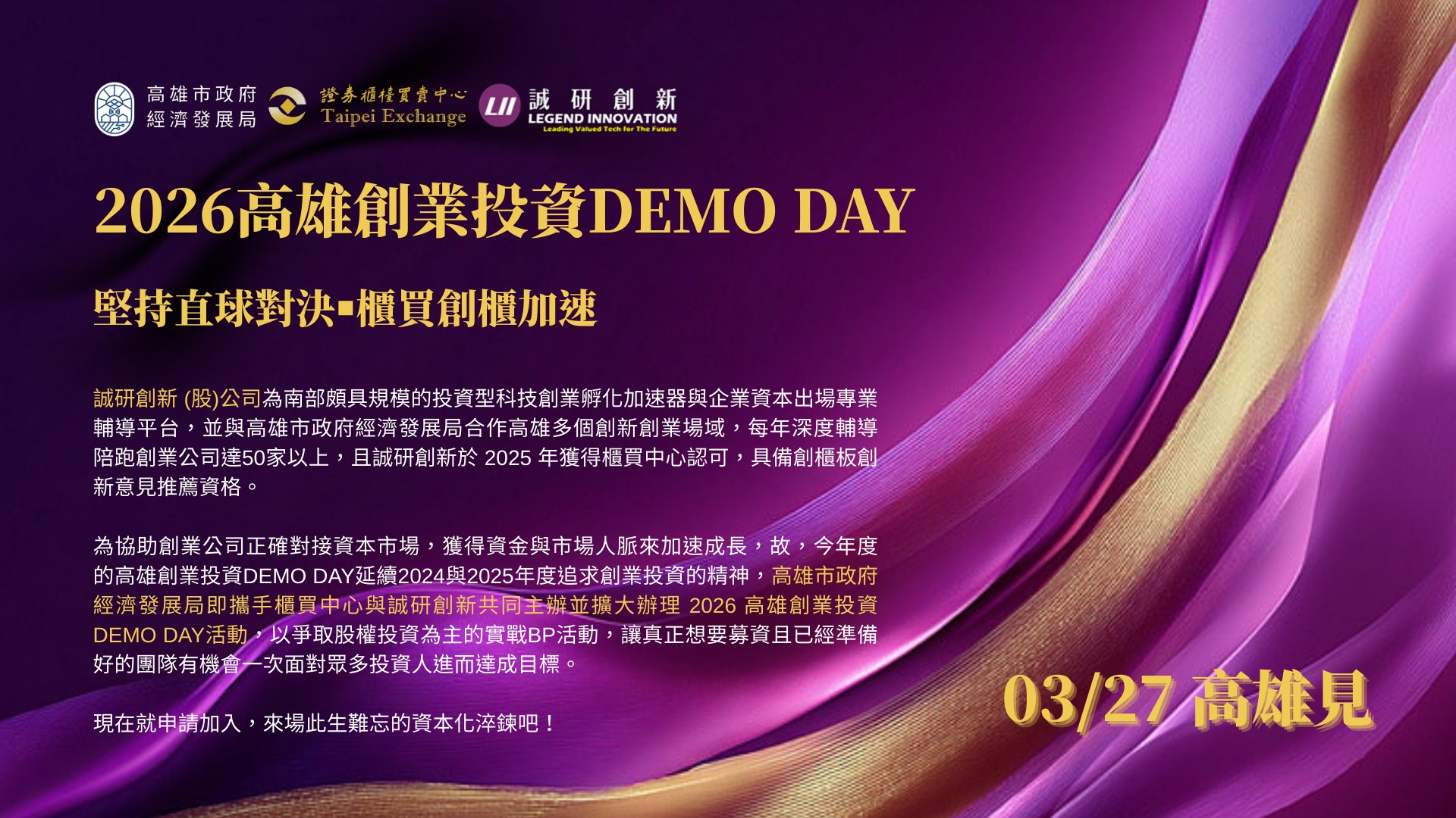 櫃買中心的最大優勢是有 30 年豐富的資本市場輔導經驗以及成功打造從創櫃、興櫃到上櫃的櫃買家族完整生態圈,鼓勵以大帶小一起把生意作大的邏輯,以善用櫃買中心這個資本市場平台。而櫃買中心為深耕覆蓋範疇,並加強布局中南部優質企業穩健邁向資本市場,和投資型科技創業孵化加速器與企業策略出場諮詢輔導專家「誠研創新股份有限公司」成為推薦單位合作夥伴,透過誠研創新本身的技術探勘與育成輔導能量,以及自有早期投資基金的直接投資,更能評估與推薦具有資本市場發展潛力與永續經營意願的創新事業單位成為櫃買家族的一員,此外,雙方也透過今年開春後的首場大型投募資DEMO DAY活動辦理,進而介接高雄市政府的創新創業政策資源與在地新創育成生態圈,期待在三方的共同合作下,讓最閃亮的創業新星在115年3 月27日DEMO DAY舞台上綻放光芒。